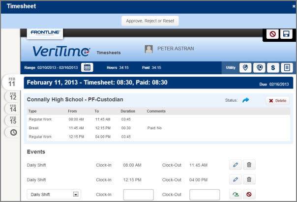 Click Approve, Reject or Reset as appropriate. Once a timesheet is approved, employees may no longer edit them. Resetting a timesheet will put it in Submitted status.
