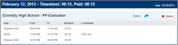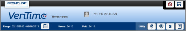 At the top of the timesheet you will see the name of the user as well as the date range, total hours, and paid hours. You will also have some utility options.