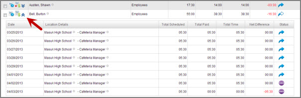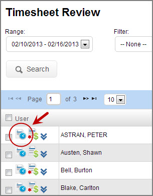 To edit an employee’s timesheet, click on the timesheet icon on the Timesheet Review page.