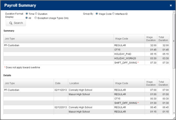 The Details section provides a detailed list of payroll information by Job Type, date, location and Wage Code.
