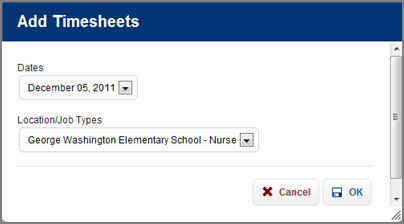 The first icon in the utility options represents Add Timesheets. Click it to bring up the pop-up window. This will allow you to enter time for a Location and Job Type that are not currently displayed. Choose a date you want to add a timesheet to and which Location/Job Type combination you would like to use. Click OK to save or Cancel to cancel.