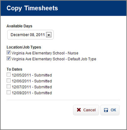 Note: If time already exists for that Location & Job Type on a day you are copying to, it will be overwritten. If time exists for a different Location & Job type on a day you are copying to, that time will still remain on that day and be unaffected by the copy process.