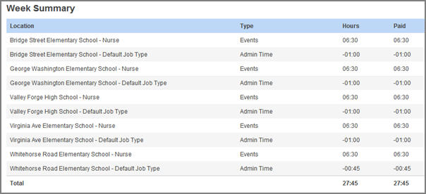 At the bottom of the timesheet, the hours for the time period will be summarized by Location/Job Type, Absences and Admin Time.