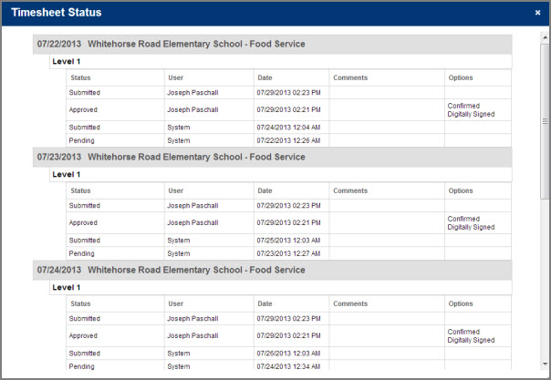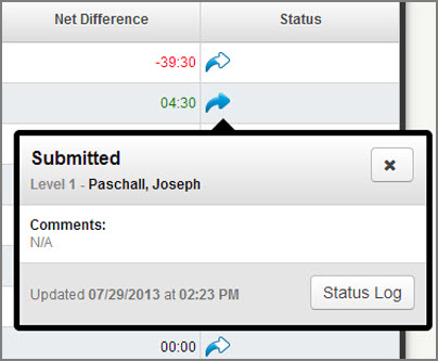 Clicking on the status icon brings up the status pop-up. The pop-up will show the last update made to that Timesheet Record whether it was submitted automatically by the system or if the User submitted it. It will also display comments if any have been entered, and list a time and date stamp for the last update. Also included in the pop-up is the Status Log button that will bring up the full status log for that timesheet record.