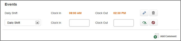To add an event, choose an event type in the drop-down menu and type the times into the empty Clock In and Clock Out boxes. Then click the green confirm button. That event will be added to the timesheet. To edit an event, click the pencil icon. Use the garbage can icon to delete an event.