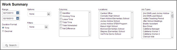At the top of the report you can filter by date range, locations, job types, and user types. You can also change the display format between time and decimal. Click the Search button to apply the filters.