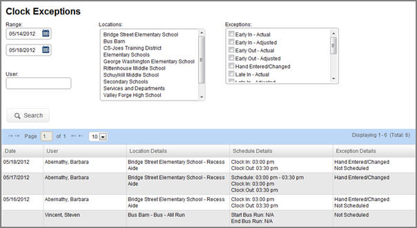 At the top of this report you can select a date range, location, and mark the exceptions you want to see. You can also enter a specific user's name. When you click Search, those preferences will be saved, becoming your default selections the next time you pull it up on that computer.