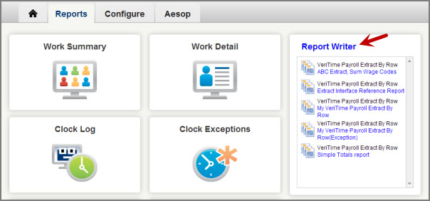 On the VeriTime home page under the Reports tab there is a section called Report Writer. This section will show a list of all of your available Report Writer reports. Click on the name of the report you want to view and the report will open in Aesop.