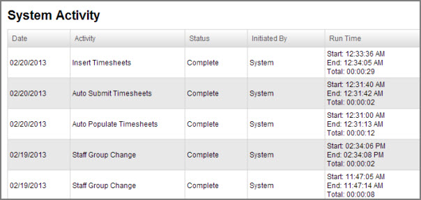 The System Activity Page displays the last 50 background processes that ran in VeriTime sorted by the most recent update.