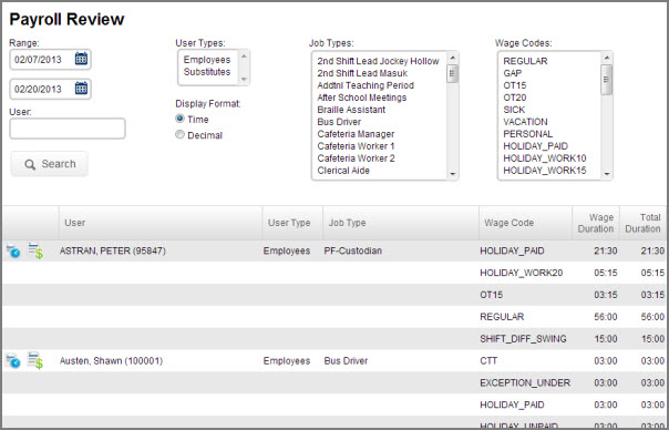 At the top of the report you can filter the results by User Type, Job Type, and Wage Code. You can also change the display format to show time or decimal.