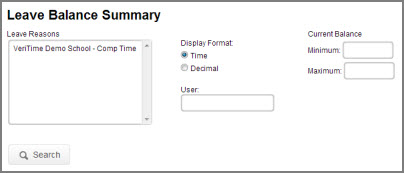For now, this report only tracks Comp Time but in the future will track other types of leave. At the top of the report you can change the display format from Time to Decimal. You can search by a specific user name as well as filter by a minimum and maximum balance.