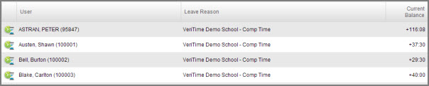 The Leave Balance Summary page displays the leave balances being tracked by VeriTime. This page will not function unless your organization is using Comp Time. Once the Comp Time Taken (CTT) wage code is assigned to a leave reason, this page will display the balances for all users for that specific leave reason.