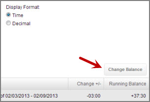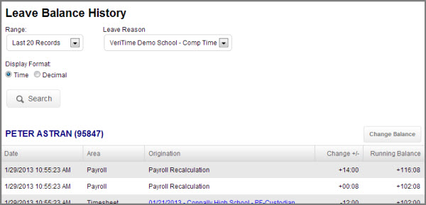 To the left of the user's name their is an icon for Leave Balance History. Click the icon to open the report. The Leave Balance History page displays all historical changes that have been applied to a balance. The last 20 records are shown by default but you can search for a custom date range up to 36 days. For each row, the grid displays information about what made the change and displays a running balance.