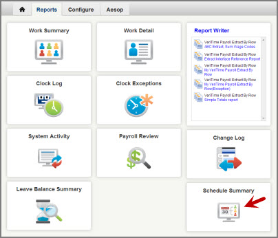 To access the report click on the Schedule Summary option from the VeriTime home page under the Reports tab.