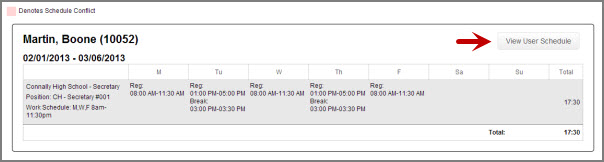 In the body of the report you will see the user's schedule summary for the date range you specified. Any conflicts will be marked in pink. To view the user's full schedule click the View User Schedule button.