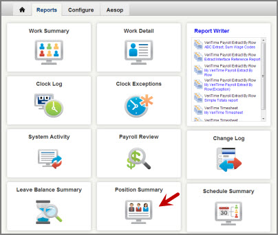 The Position Summary Report will show all details about a position including who is assigned and when. To access the report click on the Position Summary option from the VeriTime home page under the Reports tab.