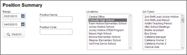At the top of the report you can filter by date range, position name, position code, location, and job type. Click the Search button to apply the filters.