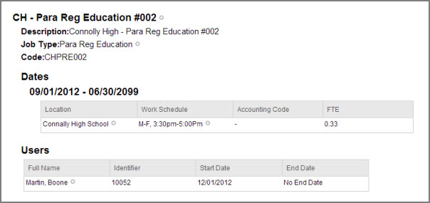 The body of the report will show a list of all positions that match your filter criteria. It will show the name and description of the position, the job type it is associated to, and the code. It will also show if date ranges have been applied to the position and which users are assigned to this position.
