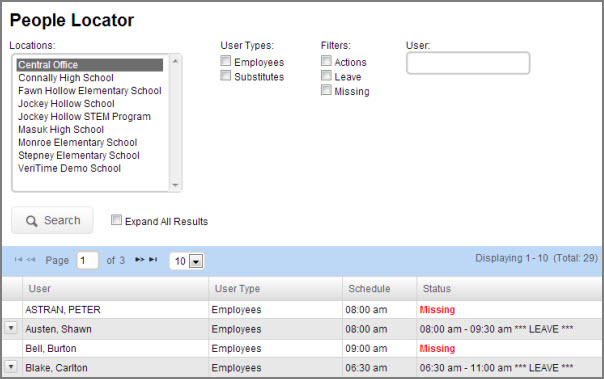The People Locator is designed to give you a snapshot of where everyone is in real-time for the current day. The key to learning this information is to focus on the Status column on the right. It will tell you the last clock event for someone.