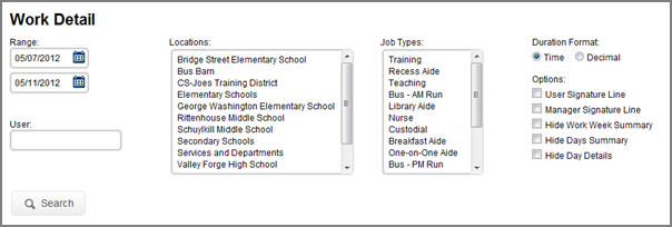The Work Detail report provides low level information about users for a given time period. The data is broken down by work week, then day, then location/job type combination.