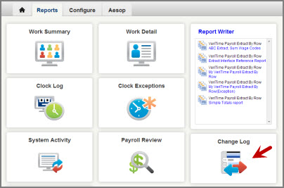 To access the Change Log click on the Change Log option from the VeriTime home page under the Reports tab.