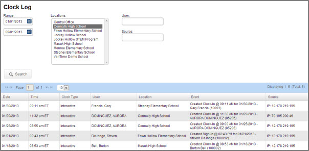To access the Clock Log click on the Clock Log link from the VeriTime home page under the Reports tab.